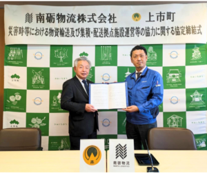 上市町としては62番目、運送業としては6番目の締結となりますが、今回の協定には災害時等に南砺物流さまの物流倉庫を支援物資の集積場や仕分けの場として利用できるほか、南砺物流さまの従業員の方々に可能な範囲で仕分け等の業務に協力いただく内容が盛り込まれています。