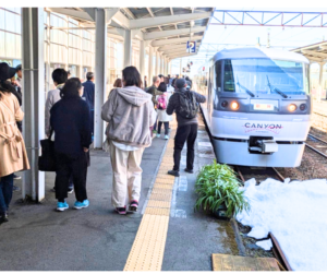 2月22日午前8時51分、上市駅2番線ホームから参加者全員による「出発・進行!」の掛け声とともに、薄紫色のキャニオンエクスプレス号が148名の参加者を乗せ、宇奈月温泉へと走り出しました。